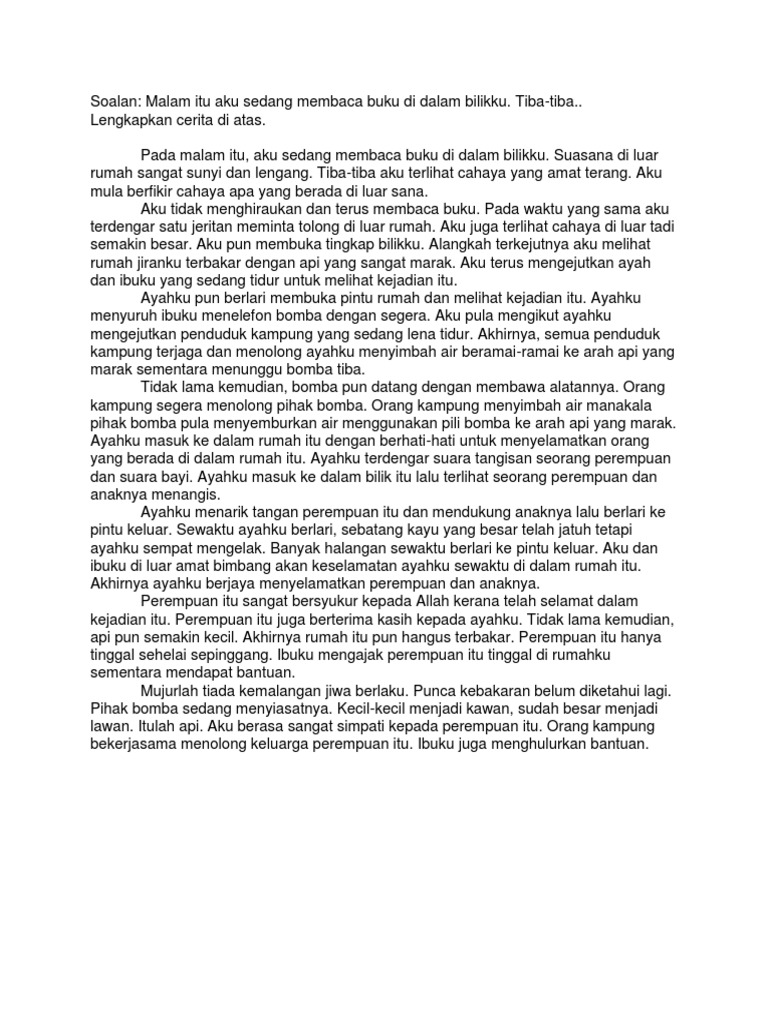 . Semoga perkongsian bahan-bahan rujukan. Hampir 10 jumlah keseluruhan kes kebakaran di Malaysia berlaku disebabkan apa yang Jabatan Bomba takrifkan sebagai sengaja dibakar dengan niat baik Contoh kes-kes. Berikut adalah contoh-contoh karangan dalam Bahagian B.